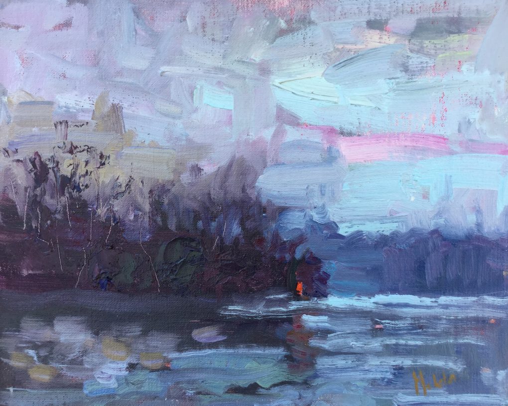 As we motored around to find a fishing spot the winter chill and waning light enveloped everything. We anchored in a quiet cove and I set my paint box on my lap. I focused on the cool/warm relationships of the scene as the red signal light appeared brighter and brighter in the settling dusk.